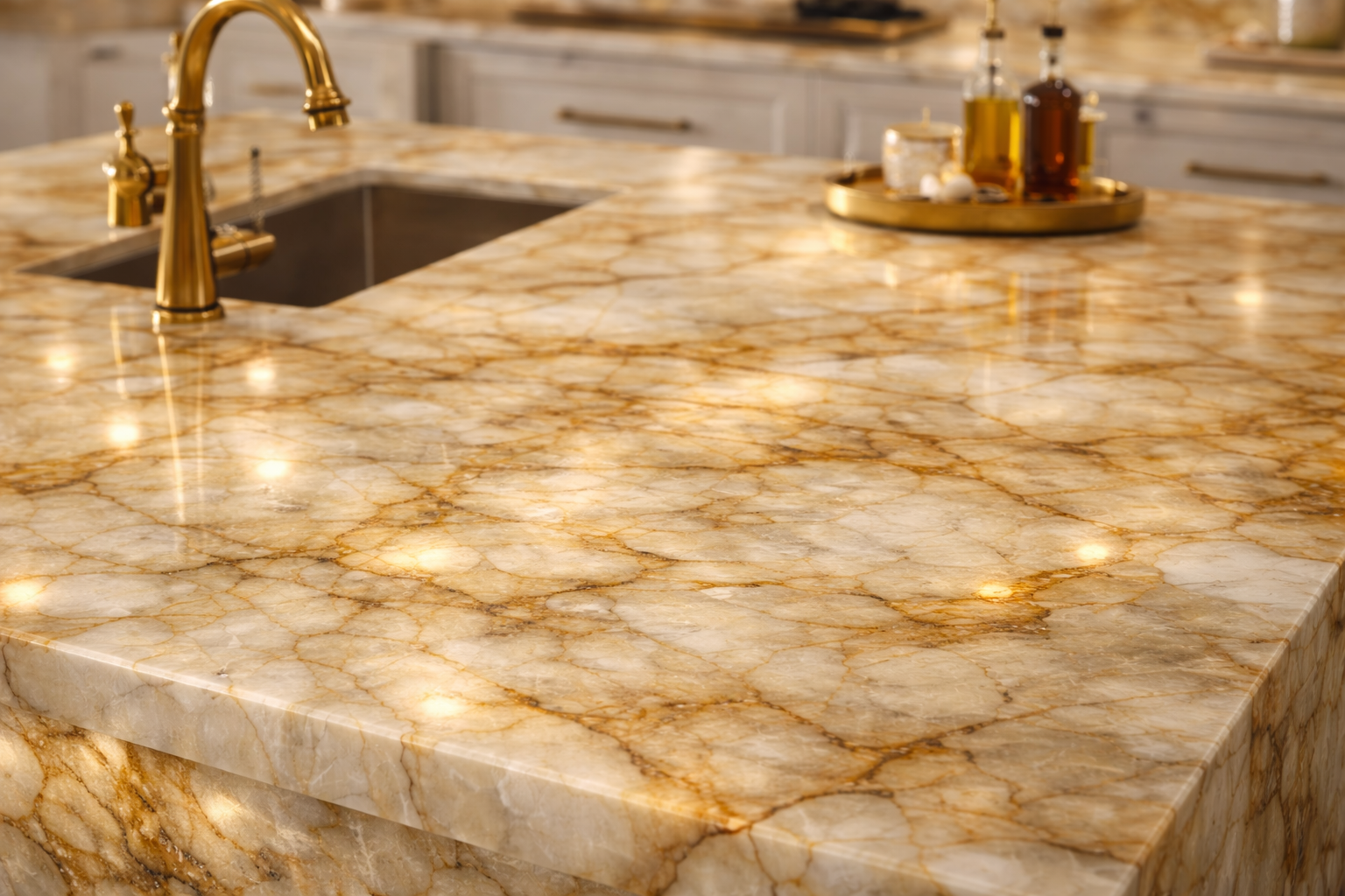 A metamorphic rock made from limestone, known for its elegant veining and translucent shine. It is softer and more porous than granite, making it prone to scratching and staining.